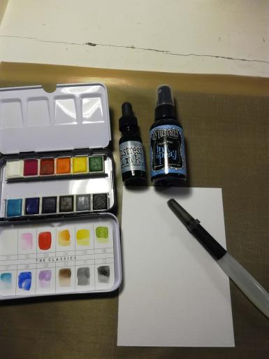 - Tästä alkoi kortintekoprosessi: Kartonkipala, vesiväriä, nestemäistä väriä ja vesisäiliösivellin