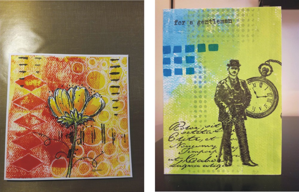 - Valmiita kortteja: näiden korttien pohjat on tehty akryylimaaleilla ja itse kuvat leimasimilla.