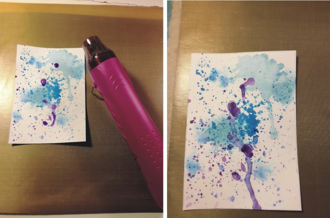 - Roiskin hieman violettia ja kuivasin sen nyt nimenomaan askarteluun tarkoitetulla kuumailmapuhaltimella. Näin väri jää voimakkaampana näkyviin. (huom. varsinkin ensikertalaisen kannattaa olla varovainen kuumailmapuhaltimen käytön kanssa).