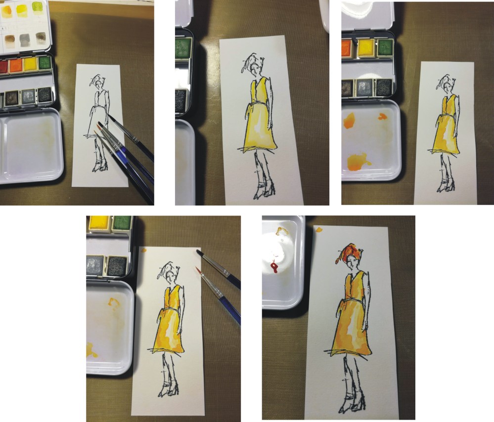 - Väritin toiselle paperille leimaamani kuvan vähitellen. Ensin vaaleammalla värillä ja kuivatuspuhaltimella. Sitten hieman tummemmalla lisää, välillä kuivatellen. Näin värit eivät sekoitu keskenään, vaan jättää tunteen, että kuvassa on valoa ja varjoa.